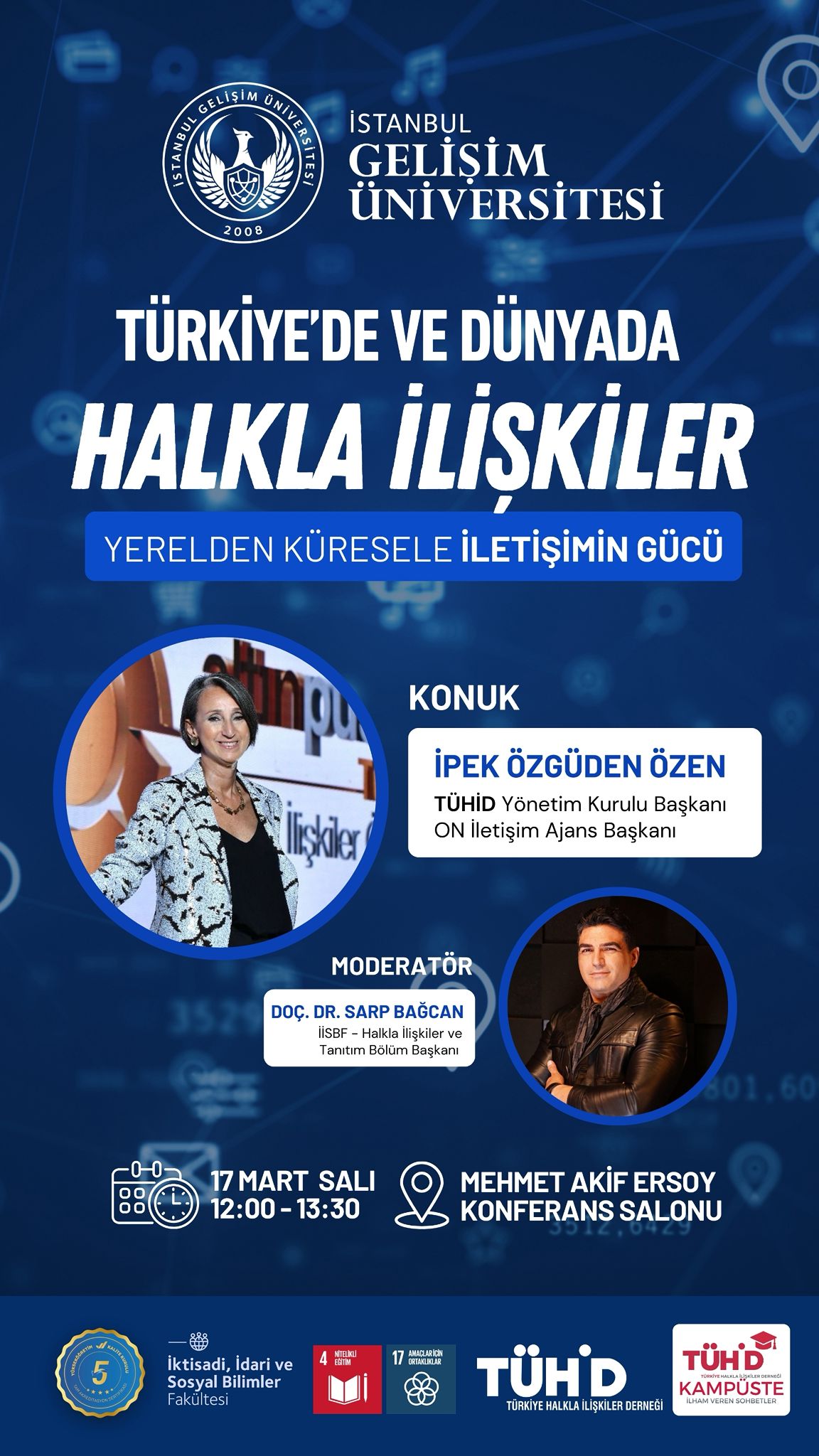 Türkiye Halkla İlişkiler Derneği (TÜHİD) Yönetim Kurulu Başkanı ve ON İletişim Ajans Başkanı İpek Özgüden Özen'in konuk konuşmacı olarak yer alacağı etkinliğin moderatörlüğünü, Bölüm Başkanımız Doç. Dr. Sarp Bağcan üstlenecektir.