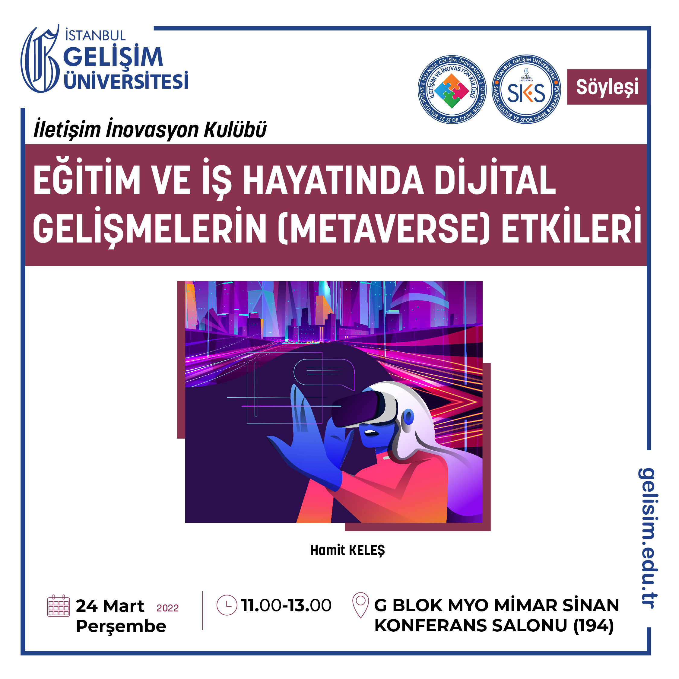 Halkla İlişkiler ve Tanıtım Bölümü öğrenci kulübü İletişim İnovasyon Kulübü çalışmalarını hız kesmeden sürdürüyor. Bu doğrultuda İletişim İnovasyon Kulübü son günlerde sıkça duyduğumuz, üzerine sıkça konuşulan ve çoğumuzun henüz pek az şey bildiği Metaverse kavramı ile ilgili bize ufuk açıcı bilgiler aktaran SpaceWalkerVR kurucusu Hamit Keleş’i, İstanbul Gelişim Üniversitesi Meslek Yüksekokulu Aziz Sancar Konferans Salonu’nda 24 Mart Perşembe günü saat 11:00’de başlayan söyleşi etkinliğinde konuk etti.