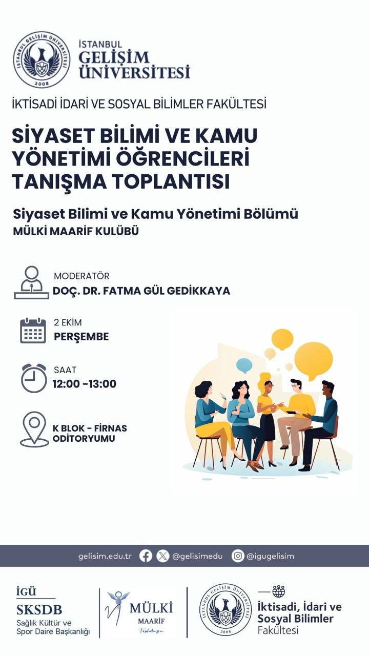 02.10.2025 Perşembe günü saat 12:00-13:00 arasında Mülki Maarif Kulübü ve Siyaset Bilimi ve Kamu Yönetimi Bölümü tarafından tüm bölüm öğrencilerimiz ile bir tanışma toplantısı gerçekleştirilecektir.