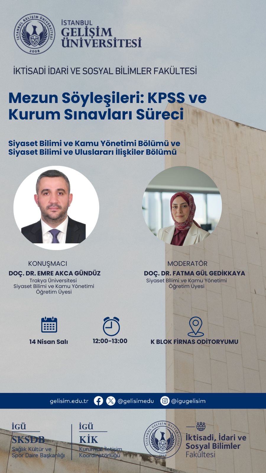 İstanbul Gelişim Üniversitesi Siyaset Bilimi ve Kamu Yönetimi ile Siyaset Bilimi ve Uluslararası İlişkiler Bölümlerinin ortak düzenleyeceği "Mezun Söyleşileri: KPSS ve Kurum Sınavları Süreci" etkinliği KPSS ve kurum sınavlarıyla ilgili merak edilenleri ve bu süreçte dikkat edilmesi gereken noktaları ele alacak.