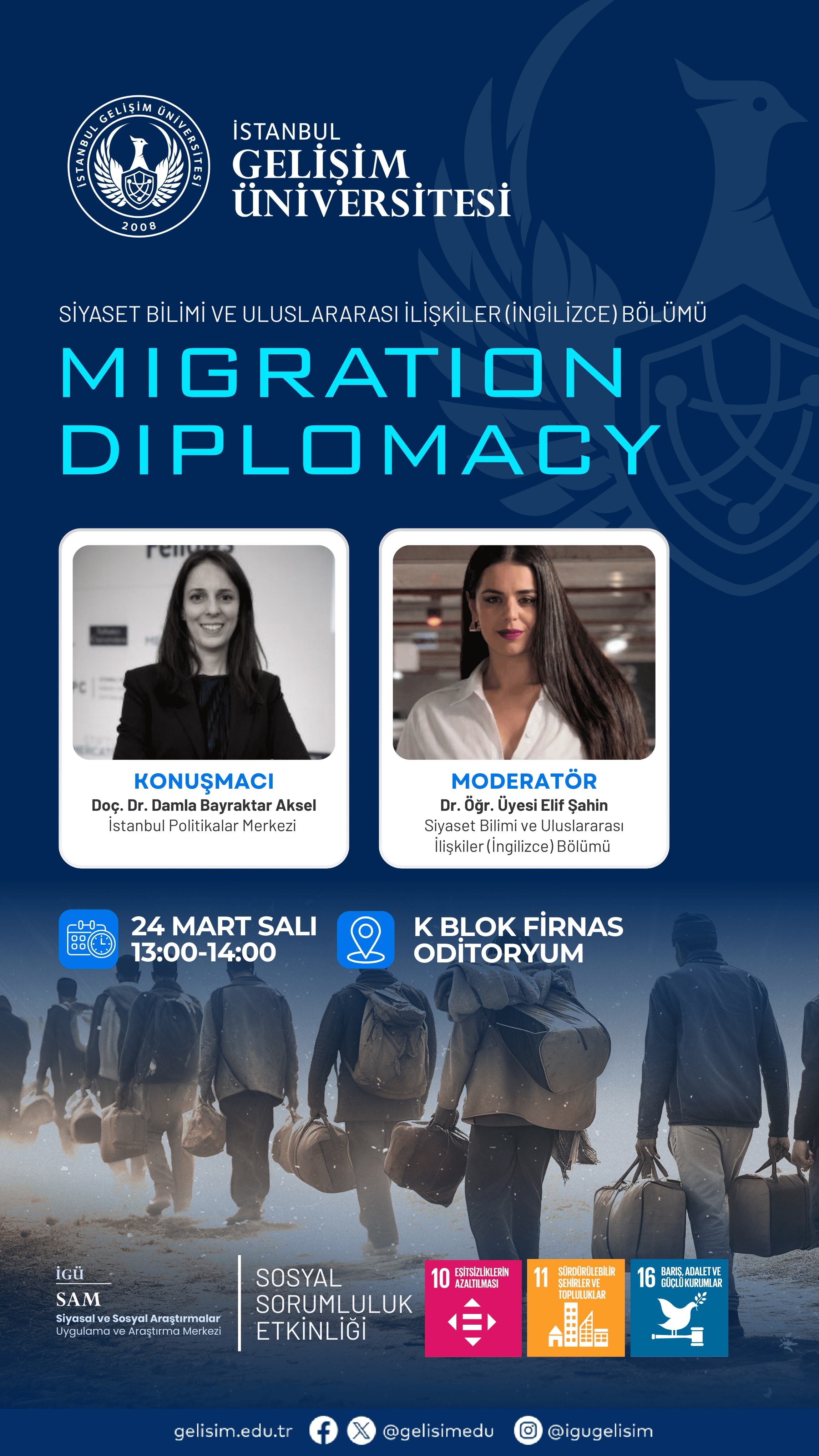 İstanbul Gelişim Üniversitesi Siyaset Bilimi ve Uluslararası İlişkiler Bölümü ve İGÜSAM tarafından düzenlenecek olan "Migration Diplomacy" (Göç Diplomasisi) konu başlıklı etkinlikte göç olgusunun devletlerin bir diplomasi aracı olarak kullanılması tartışılacaktır.