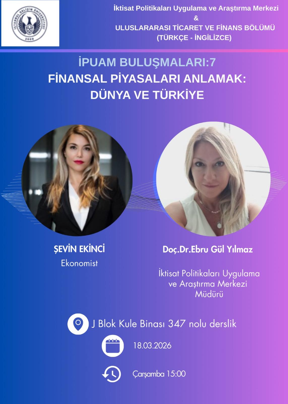 İktisat Politikaları Uygulama ve Araştırma Merkezi (IPUAM) Müdürü ve Uluslararası Ticaret ve Finansman Bölümü Öğretim Üyesi Doç. Dr. Ebru Gül YILMAZ tarafından düzenlenen ve Ekonomist Şevin EKİNCİ’nin konuk olduğu “Finansal Piyasaları Anlamak: Dünya ve Türkiye” başlıklı etkinlik başarıyla gerçekleştirildi. Akademisyenler ve öğrencilerin yoğun ilgi gösterdiği programda, finansal piyasaların temel dinamikleri ve yatırımcı davranışları kapsamlı şekilde ele alındı.