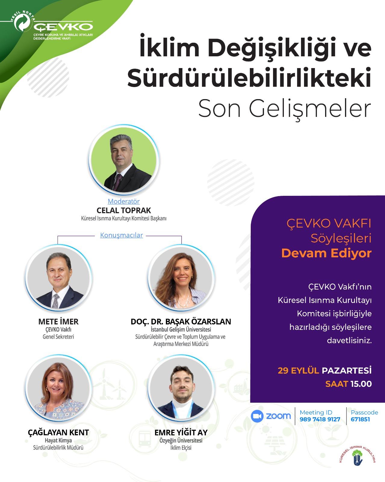 Moderatörlüğünü Küresel Isınma Kurultayı Komitesi Başkanı Celal Toprak’ın yaptığı etkinliğe, ÇEVKO Vakfı Genel Sekreteri Mete İmer, Hayat Kimya Global Kurumsal İletişim ve Sürdürülebilirlik Direktörü Çağlayan Kent, Özyeğin Üniversitesi İklim Elçisi Emre Yiğit Ay ve İstanbul Gelişim Üniversitesi Sürdürülebilir Çevre ve Toplum Uygulama ve Araştırma Merkezi Müdürü, Uluslararası Ticaret ve İşletmecilik Bölümü Öğretim Üyesi Doç. Dr. Başak Özarslan Doğan konuşmacı olarak katıldı.