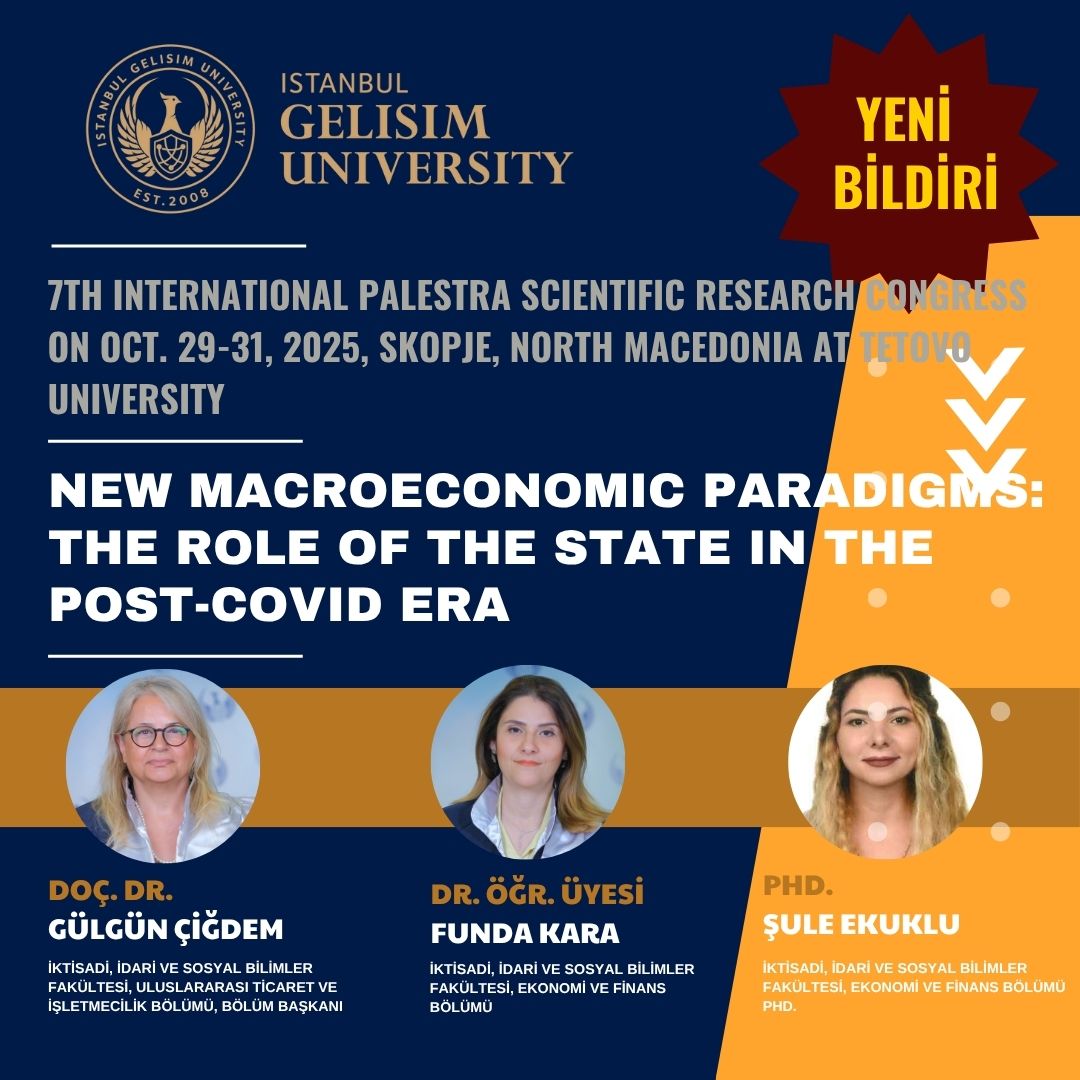 Uluslararası Ticaret ve İşletmecilik Bölümü, Bölüm Başkanı Doç. Dr. Gülgün Çiğdem, Dr. Öğr. Üyesi Funda Kara ve Şule EKUKLU tarafından gerçekleştirilen “Yeni Makroekonomik Paradigmalar: Post-COVID Dönemde Devletin Rolü” başlıklı çalışma, bu dönüşümü tarihsel ve kuramsal bir perspektiften ele alıyor. Çalışma, klasik, Keynesyen ve neoliberal yaklaşımlar ile karşılaştırmalı bir analiz sunarak, pandemi sonrasında güç kazanan “aktif devlet” modelini yeni bir makroekonomik paradigma olarak tartışıyor.