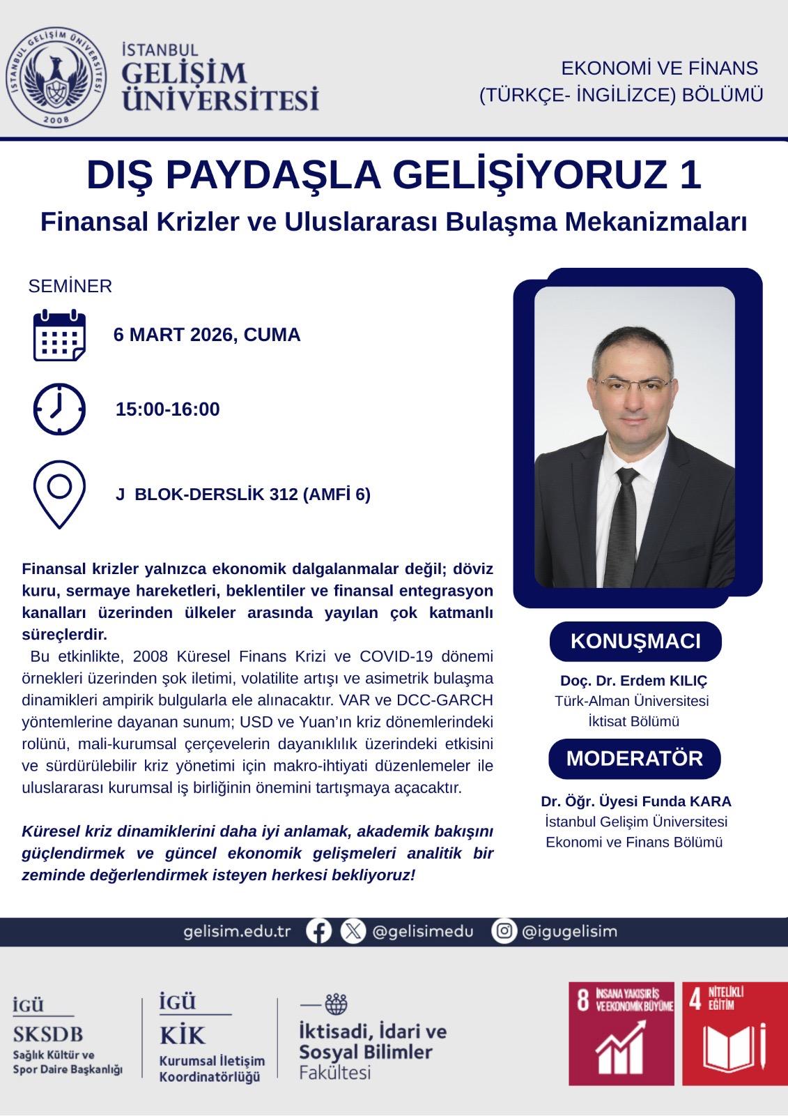 Ekonomi ve Finans Bölümü tarafından düzenlenen “Dış Paydaşla Gelişiyoruz” etkinlik serisinin ilkinde, finansal krizlerin uluslararası boyutu ele alındı. 6 Mart 2026 tarihinde gerçekleştirilen seminerde; 2008 Küresel Finans Krizi ve COVID-19 dönemi örnekleri üzerinden finansal şokların ülkeler arasında nasıl yayıldığı, döviz kurları, sermaye hareketleri ve beklenti kanalları üzerinden kriz bulaşma mekanizmaları akademik bir bakış açısıyla değerlendirilmiştir.
