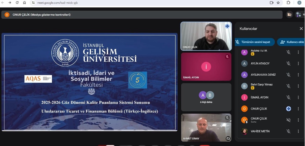İktisadi, İdari ve Sosyal Bilimler Fakültesi Dekanlığı, fakülte kalite kurulu ve bölüm başkanları 19 Kasım 2024 Salı günü online olarak bir araya geldi. Toplantıda dış paydaşlara bölüm müfredatları, kalite puanlama sistemi ve YÖKAK hakkında bilgilendirmeler yapıldı.
